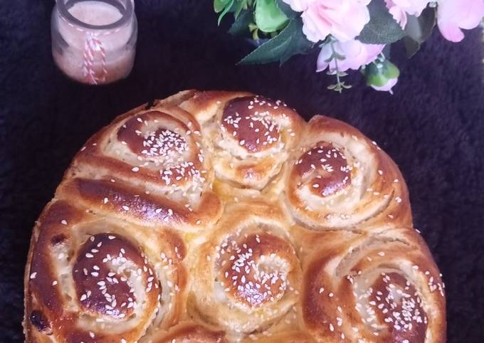 - Couper la pâte en morceaux et les mettre dans un poule les surtout les séparer un peu puis laisser doublé le volume et maître un peu de jaune d'oeuf un peu de sésame puis au four 180' Et bonne appétit.
