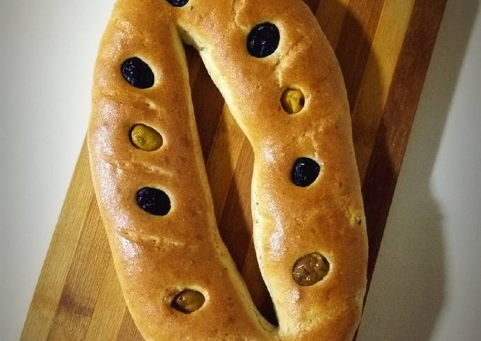 - Agrémentez le pain d'olives vertes/grecques et faites des incisions avec le couteau..