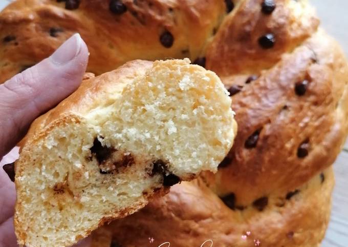 - Dégazer la pâte, formé un boudin, l'étaler puis déposer les pépites de chocolat et rouler le sur lui-même. Le découper en deux sur la longueur puis le tressé..